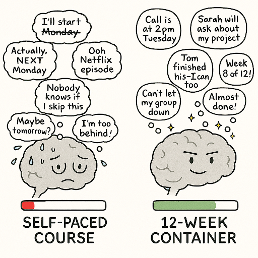 A container creates the conditions where people actually do the work, so that transformation actually happens. You have a clear beginning and end that creates urgency – not artificial scarcity, but genuine momentum. Everyone moves through the material together, creating social momentum that pulls people forward even when they want to quit. Live touchpoints create real accountability because people know others are expecting them to show up. The facilitator is actively present in the process, not just available if someone has a question.