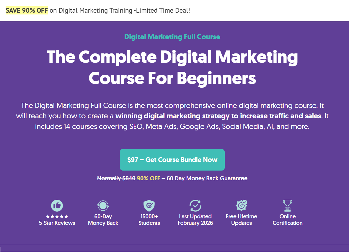 The Digital Marketing Full Course is a comprehensive training bundle covering multiple areas of online marketing, including SEO, paid advertising, content marketing, analytics, and AI-driven strategies.