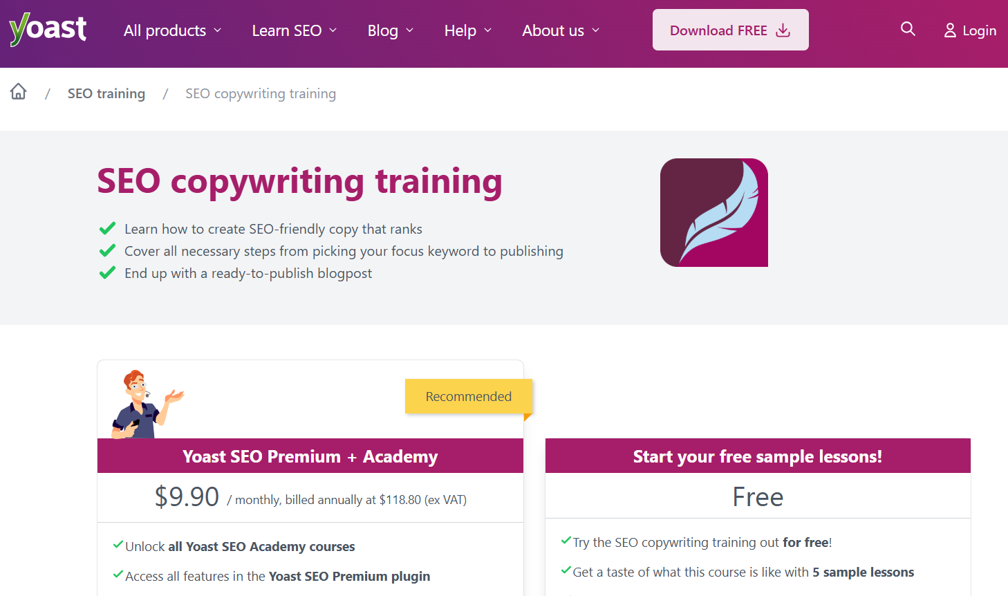 - Cost: $118.80/year for a Yoast Premium subscription that includes all Yoast academy courses